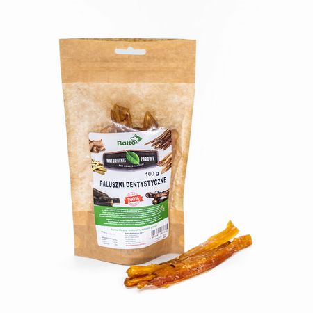 Paluszki dentystyczne to twardy o niezbyt intensywnym zapachu gryzak w formie pasków. Wysoka zawartość kolagenu oraz glukozaminy korzystnie wpływa na układ stawowo-mięśniowy zwłaszcza w okresie wzrostu psa. Chrzęstna struktura gryzaka pomaga czyścić zęby z płytki nazębnej oraz poprawia kondycję dziąseł, dbając o prawidłowe uzębienie psa. Przysmak zalecany dla wszystkich psów, zwłaszcza szczeniąt oraz dużych psów.
