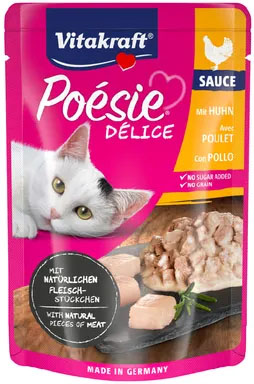 Vitakraft Poesie Delice to pełnowartościowa karma w niezwykle delikatnym, łagodnym sosie. Zawiera wysokiej jakości kawałki mięsa. Nie zawiera cukru ani zbóż jak również sztucznych konserwantów, barwników i aromatów.