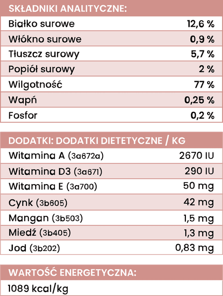 Skład: jeleń (88,75 %, w tym: 88,75 % mięso mięśniowe), cukinia (8 %), nasiona chia (1 %), witaminy i minerały (1 %), inulina (0, 65 %), algi morskie brunatne (0,24 %), olej z kryla (0,24 %), zioła (0,12 %, w tym: dzika róża, pokrzywa, jeżówka, kurkuma, ostropest plamisty).