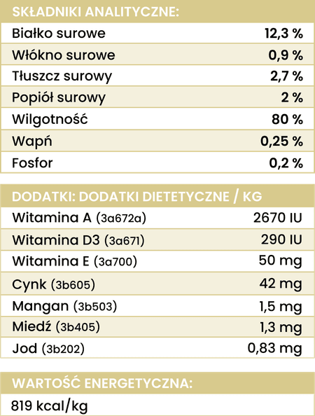 Wapń: 0,25% ; fosfor: 0,20%