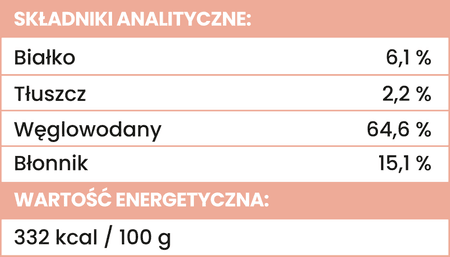 Składniki analityczne: białko surowe 6,1%, tłuszcz 2,2%, węglowodany 64,6%, błonnik 15,1%.