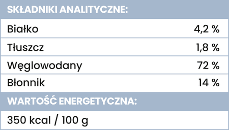 Składniki analityczne: białko surowe 4,2%, tłuszcz 1,8%, węglowodany 72%, błonnik 14%.