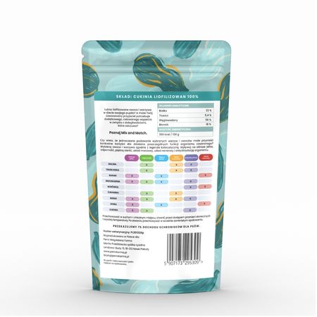 CUKINIA jest bogatym w błonnik warzywem, które idealnie wspomaga trawienie i pracę jelit. Jest niskokaloryczna i lekkostrawna – idealna dla psów z nadwagą lub tych, z wrażliwym układem pokarmowym. Cukinia to również doskonałe źródło witamin i minerałów – zawiera witaminę A,K oraz C, a dodatkowo kwas foliowy, potas i mangan. To również idealne wsparcie dla układu odpornościowego – dzięki zawartym w cukinii przeciwutleniaczom. Cukinia znana jest również, ze swoich właściwości przeciwzapalnych – zawiera związki, które mogą łagodzić stany zapalne w organizmie.