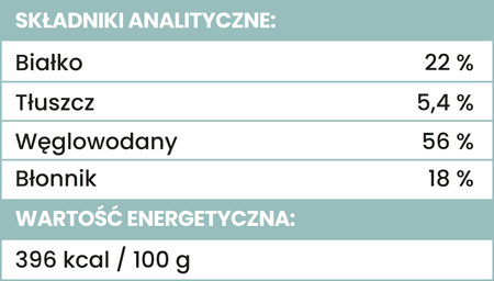 Składniki analityczne: białko surowe 22%, tłuszcz 5,4%, węglowodany 56%, błonnik 18%.