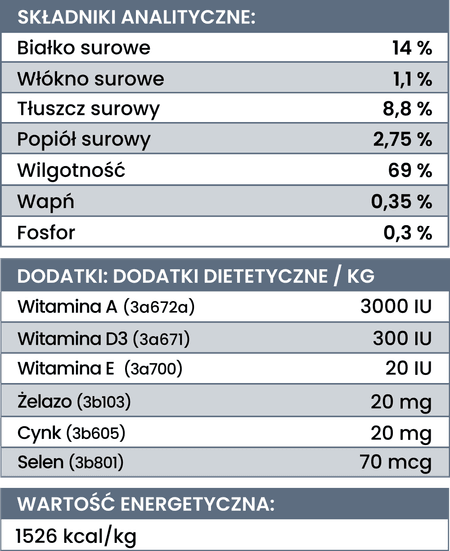 Skład: indyk (88,8 %, w tym: 74,2 % mięso mięśniowe, 14,6 % serca indycze), dynia (8 %), olej z łososia (1 %), witaminy i minerały (1 %), inulina (0,65 %), algi morskie brunatne (0,29 %), małż nowozelandzka (0,14 %), zioła (0,12%, w tym: dzika róża, pokrzywa, jeżówka, kurkuma, ostropest plamisty).